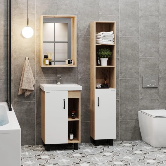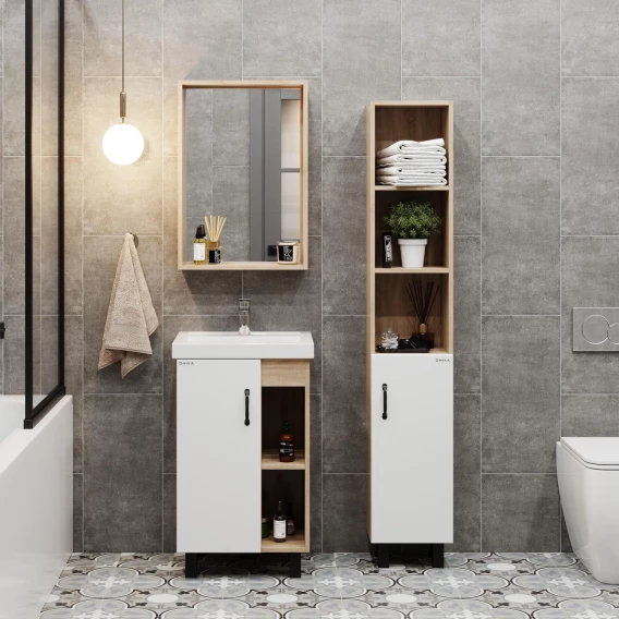 В тумбе Onika Тимбер 50 удачно сочетаются контрастные цвета и фактуры: белый матовый фасад с покрытием SoftTouch, корпус цвета дуба с роскошной текстурой, черная матовая металлическая фурнитура. Открытые полки справа обеспечивают быстрый доступ к часто используемым аксессуарам, а пространство за распашной дверцей слева, снабженной системой плавного закрывания, станет удобным местом для хранения различных бытовых принадлежностей.Корпус тумбы выполнен из ЛДСП, фасад - из ЛМДФ в пленке, устойчивых к механическим воздействиям, перепадам температур и высокой влажности.Черная металлическая ручка и 4 ножки (2 черных и 2 пластиковых) идут в комплекте с тумбой.