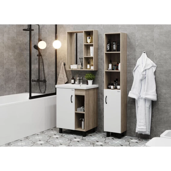 В тумбе Onika Тимбер 60 удачно сочетаются контрастные цвета и фактуры: белый матовый фасад с покрытием SoftTouch, корпус цвета дуба с роскошной текстурой, черная матовая металлическая фурнитура. Открытые полки справа обеспечивают быстрый доступ к часто используемым аксессуарам, а пространство за распашной дверцей слева, снабженной системой плавного закрывания, станет удобным местом для хранения различных бытовых принадлежностей.Корпус тумбы выполнен из ЛДСП, фасад - из ЛМДФ в пленке, устойчивых к механическим воздействиям, перепадам температур и высокой влажности.Черная металлическая ручка и 4 ножки (2 декоративных черных и 2 пластиковых) идут в комплекте с тумбой.