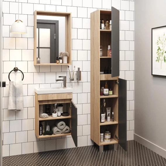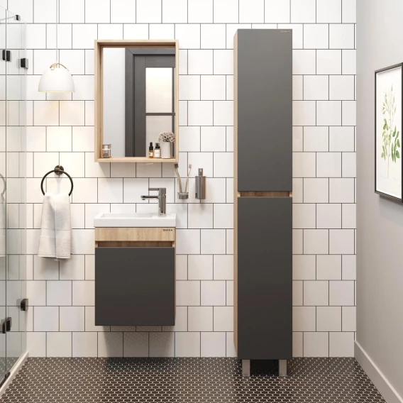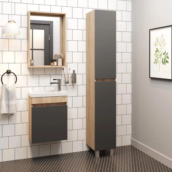 Подвесная тумба для ванной комнаты Onika Милтон 45 - идеальное решение для небольшого санузла.Тумба сочетает в себе красоту и функциональность: серый матовый фасад с покрытием SoftTouch, корпус цвета дуб сонома с роскошной текстурой, строгие формы без декора. За дверцей с интегрированной ручкой скрывается пространство с полкой для размещения необходимых бытовых принадлежностей. Корпус тумбы выполнен из ЛДСП, фасад - из ЛМДФ в пленке, специально предназначенных для использования в условиях высокой влажности. Тумба надежно крепится к стене и не занимает место на полу, не создавая при этом сложностей в уборке помещения.Подвесы для крепления тумбы - в комплекте.