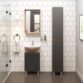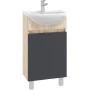 Напольная тумба для ванной комнаты Onika Милтон 45 - идеальное решение для небольшого санузла.Тумба сочетает в себе красоту и функциональность: серый матовый фасад с покрытием SoftTouch, корпус цвета дуб сонома с роскошной текстурой, строгие формы без декора. За дверцей с интегрированной ручкой скрывается пространство с полкой для размещения необходимых бытовых принадлежностей. Корпус тумбы выполнен из ЛДСП, фасад - из ЛМДФ в пленке, специально предназначенных для использования в условиях высокой влажности. Ножки (2 декоративных хромированных и 1 пластиковая) идут в комплекте с тумбой.
