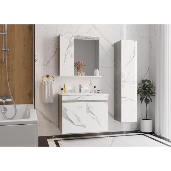 Подвесная тумба Onika Марбл 75 станет стильным и функциональным элементом пространства современной ванной комнаты. Спроектированная дизайнерами в минималистичном облике, тумба отражает самые актуальные расцветки сезона - бетон и мрамор.Пространство за 2-ми распашными дверцами, снабженными системой плавного закрывания, станет удобным местом для хранения необходимых в ванной комнате вещей.Белые матовые ручки практически не заметны на фасаде и не отвлекают взгляд от текстуры мрамора.Корпус тумбы выполнен из ЛДСП, фасады ящиков - из ЛМДФ в пленке, устойчивых к механическим воздействиям, перепадам температур и высокой влажности.Тумба надежно крепится к стене и не занимает место на полу, не создавая при этом сложностей в уборке помещения.Подвесы для крепления тумбы и 4 белые матовые ручки - в комплекте.