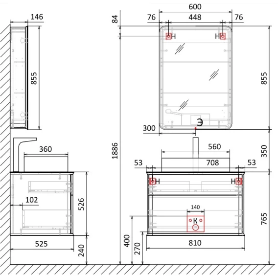 Механизм доводчика, Ящик, Полочка, LED подсветка, Зеркало-шкаф, Розетка, Сенсорный выключатель, Система "Push-to-open", Столешница, Тумба под раковину, Раковина