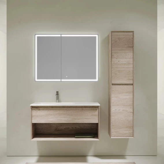 Крепление, Механизм доводчика, Ящик, Полочка, LED подсветка, Зеркало-шкаф, Сенсорный выключатель, Тумба под раковину, Раковина