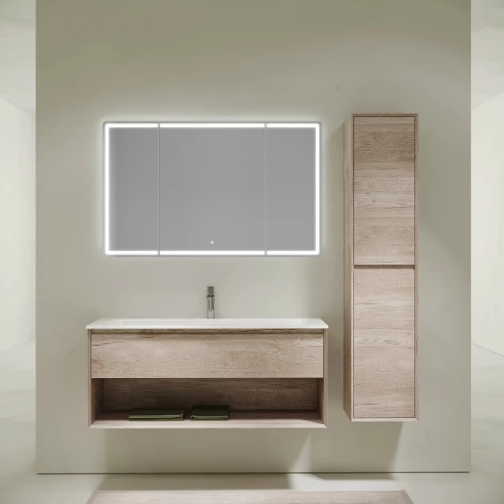 Крепление, Механизм доводчика, Ящик, Полочка, LED подсветка, Зеркало-шкаф, Сенсорный выключатель, Тумба под раковину, Раковина