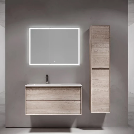 Крепление, Механизм доводчика, Ящик, Полочка, LED подсветка, Зеркало-шкаф, Сенсорный выключатель, Тумба под раковину, Раковина