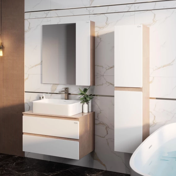 Подвесная тумба Onika Алеста 80 отражает актуальные тенденции в дизайне мебели для ванной комнаты: минимализм и геометрия фасадов, белый глянец и текстура бетонного камня, отсутствие декора, столешница из керамогранита и накладная раковина.Два ящика с направляющими скрытого монтажа с доводчиками разделены на отсеки для удобной организации косметических средств и других аксессуаров.Корпус тумбы выполнен из ЛДСП, фасад - из ЛМДФ, покрытой эмалью, устойчивых к механическим воздействиям, перепадам температур и высокой влажности.Тумба надежно крепится к стене и не занимает место на полу, не создавая при этом сложностей в уборке помещения.Подвесы для крепления тумбы - в комплекте.