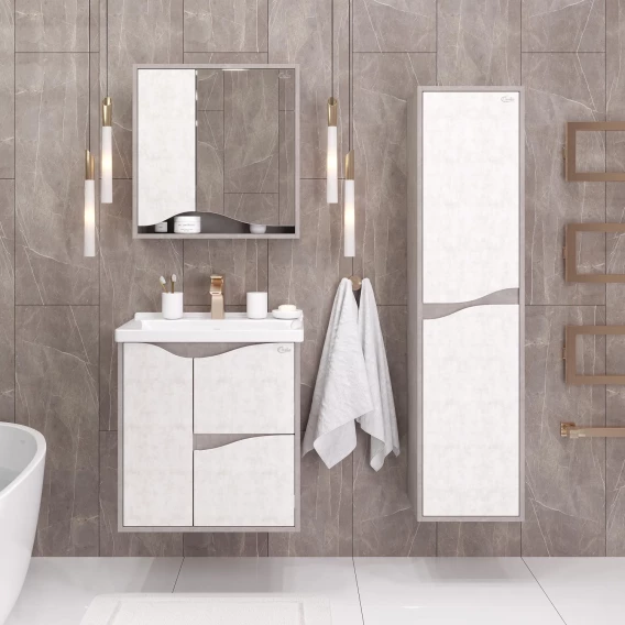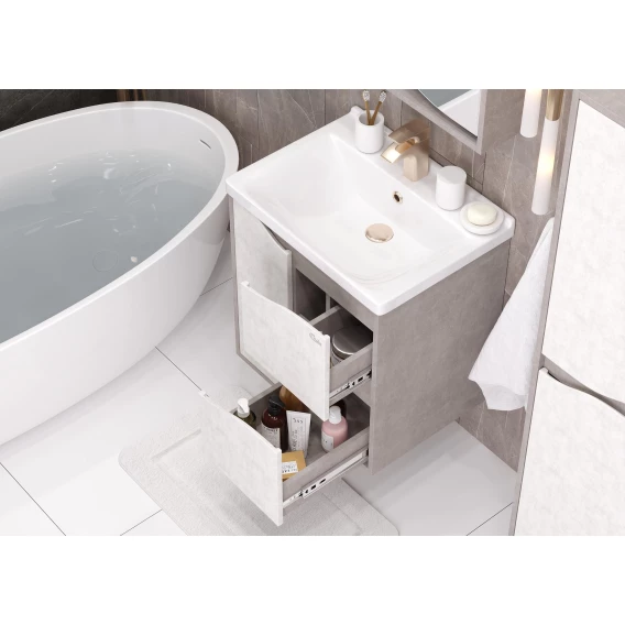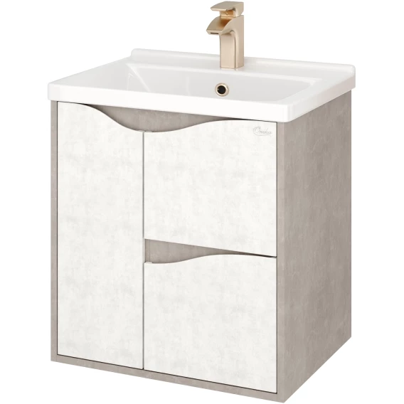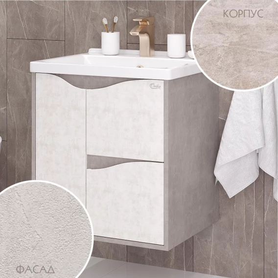 Подвесная тумба для ванной комнаты Onika Брендон 60 поможет создать особенную атмосферу ванной комнаты: текстуры камня и бетона гармонично дополняют друг-друга, создавая сдержанный выразительный акцент в интерьере.Тумба имеет два ящика, снабженные системой плавного закрывания: нижний предназначен для больших предметов, а верхний, имеющий удобную систему организации пространства, - для мелких аксессуаров. Слева от ящиков - распашная дверца с доводчиком, скрывающиая пространство, разделенное съемной полочкой. Ручки, изящно интегрированные в фасады, позволяют сделать эксплуатацию мебели более удобной и практичной.Корпус тумбы выполнен из ЛДСП, фасады ящиков - из ЛМДФ в пленке, устойчивых к механическим воздействиям, перепадам температур и высокой влажности, при этом тумба надежно крепится к стене и не занимает место на полу, не создавая при этом сложностей в уборке помещения.Подвесы для крепления тумбы - в комплекте.