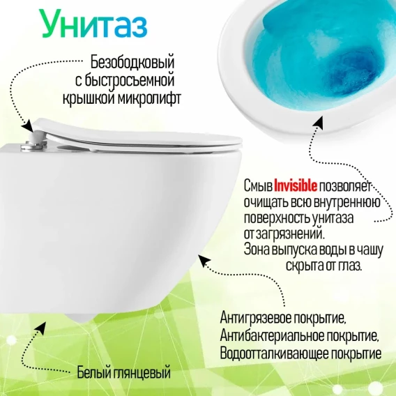 Крепление, Кнопка смыва, Инсталляционная система, Звукоизолирующая прокладка, Унитаз, Сиденье с микролифтом