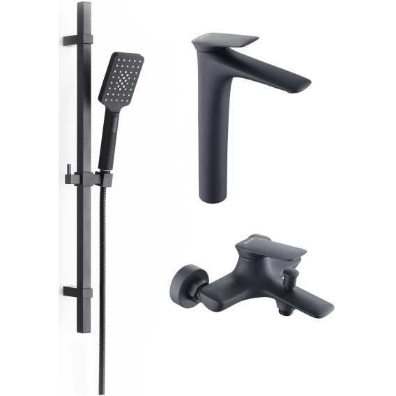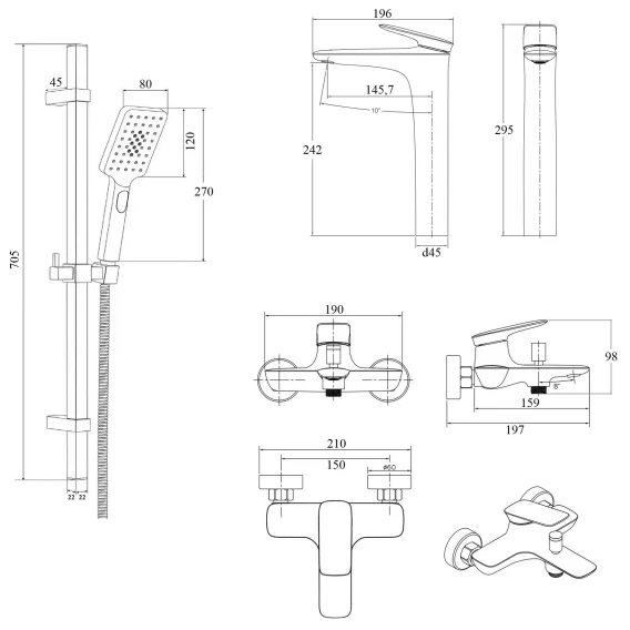 Крепление, Аэратор, Гибкая подводка, Металлическая розетка, Эксцентрики, Душевой шланг, Душевая лейка, Держатель для душевой лейки, Смеситель, Штанга душевая