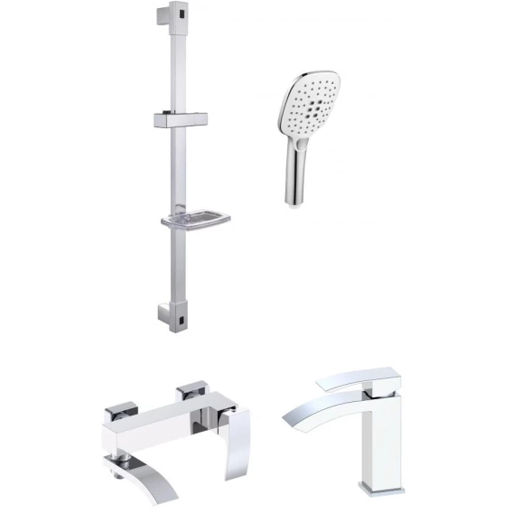 Крепление, Аэратор, Гибкая подводка, Металлическая розетка, Эксцентрики, Душевой шланг, Душевая лейка, Держатель для душевой лейки, Смеситель, Мыльница, Штанга душевая
