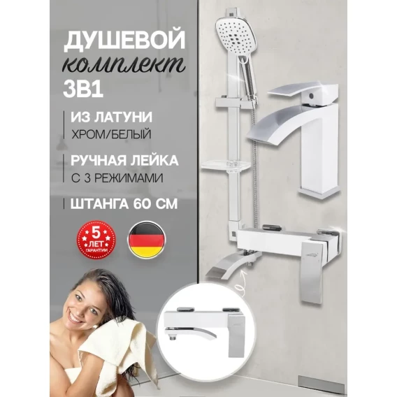 Крепление, Аэратор, Гибкая подводка, Металлическая розетка, Эксцентрики, Душевой шланг, Душевая лейка, Держатель для душевой лейки, Смеситель, Мыльница, Штанга душевая