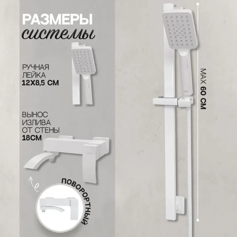 Крепление, Аэратор, Гибкая подводка, Металлическая розетка, Эксцентрики, Душевой шланг, Душевая лейка, Держатель для душевой лейки, Смеситель, Штанга душевая