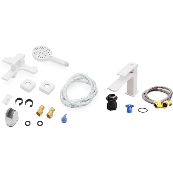 Крепление, Аэратор, Гибкая подводка, Металлическая розетка, Эксцентрики, Душевой шланг, Душевая лейка, Держатель для душевой лейки