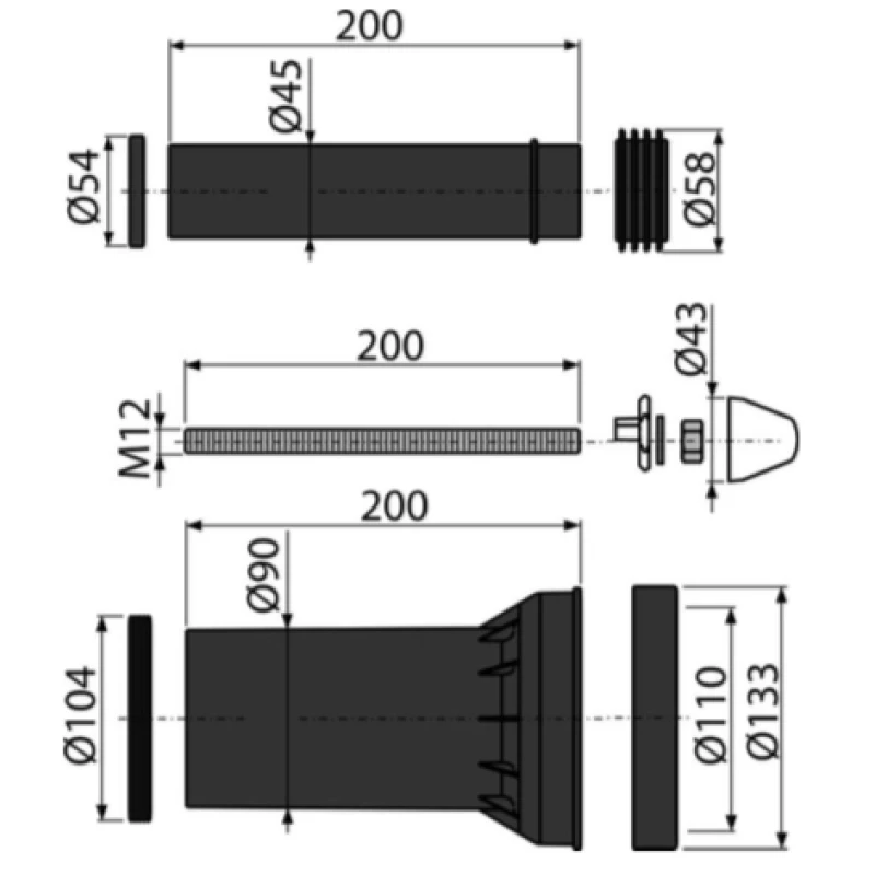 • Патрубок сливной для подключения подвесного унитаза к стокам, полипропилен, Ø90 мм, с прокладками