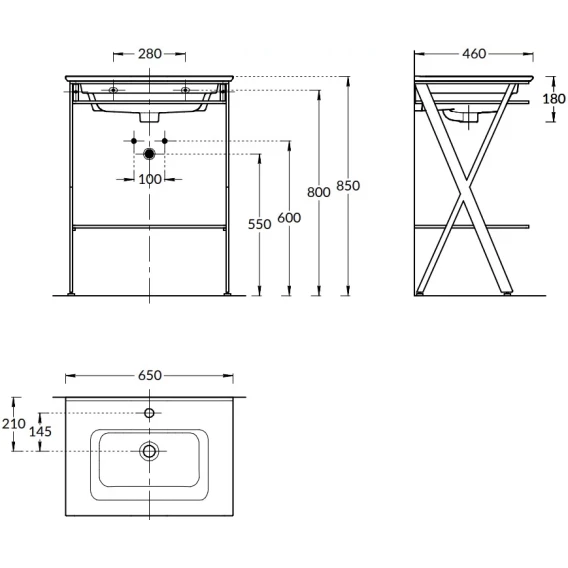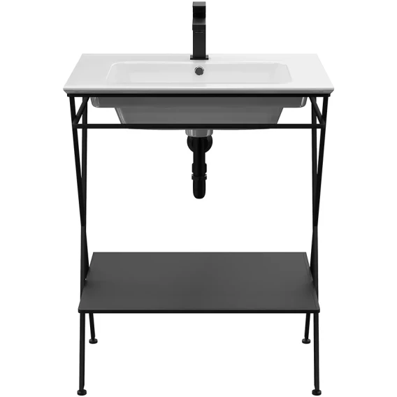 Металлическая структура рассчитана на раковину PIANO шириной 65 см. Из металла, окрашенного в чёрный матовый цвет, выполнены две крестообразные ножки, нижняя полка для мелочей и верхняя рама: она служит элементом опоры раковины и одновременно держателем для полотенец. В комплект также входят четыре регулируемых подпятника для более точной установки.