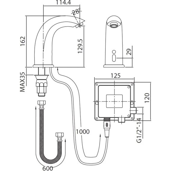 • Угловой клапан с фильтром и батарея в комплект не входят