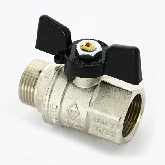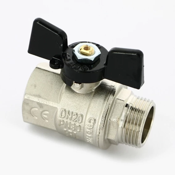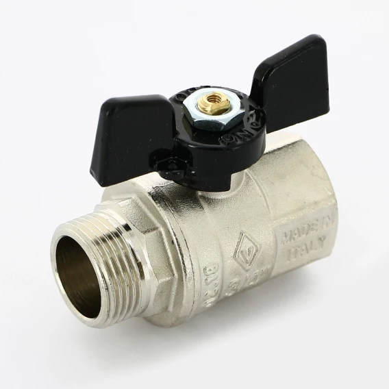 Кран шаровой латунный, полнопроходной, резьбы наружная - внутренняя по ISO 228/1Ручка - "бабочка" из алюминия