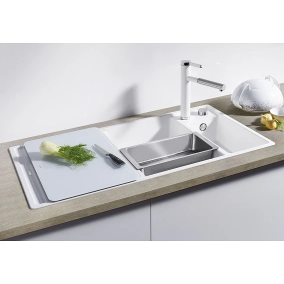 Коландер, Разделочная доска из безопасного стекла, Отводная арматура с корзинчатым вентилем 3 1/2'' InFino, Отводная арматура с клапаном-автоматом 3 1/2'' InFino