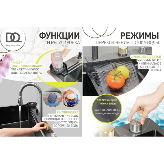 10) Для снижения уровня шума льющейся воды чаша мойки покрыта специальным шумоизоляционным материалом Quietness by DQ