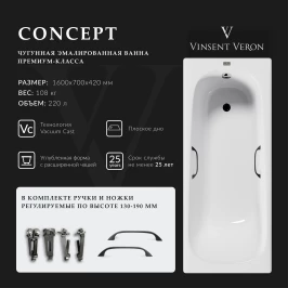 Ванна чугунная Vinsent Veron Concept VCO1607042H/VH0012BL 160x70 см, с ручками, белый