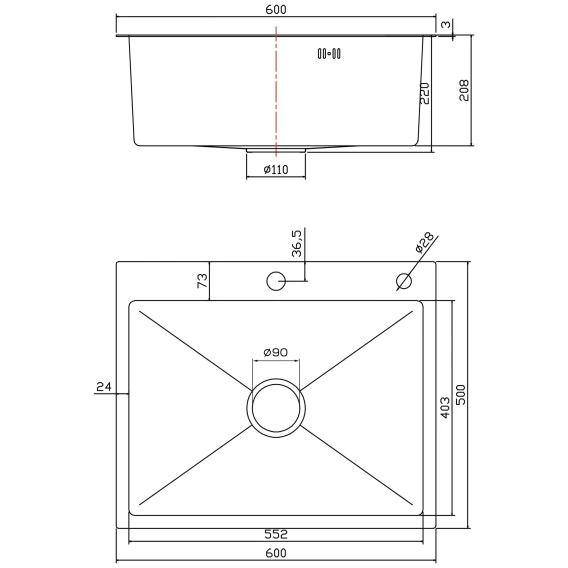 - Дополнительное отверстие 28мм — подходит для установки дозатора, а так же можно установить пневмокнопку от измельчителей пищевых отходов Fmark FCD-602 и FCD-703.