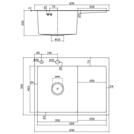 - Дополнительное отверстие 28мм — подходит для установки дозатора, а так же можно установить пневмокнопку от измельчителей пищевых отходов Fmark FCD-602 и FCD-703.