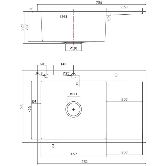 - Габариты мойки: 750 × 500 × 220 мм (Д × Ш × Глубина чаши)