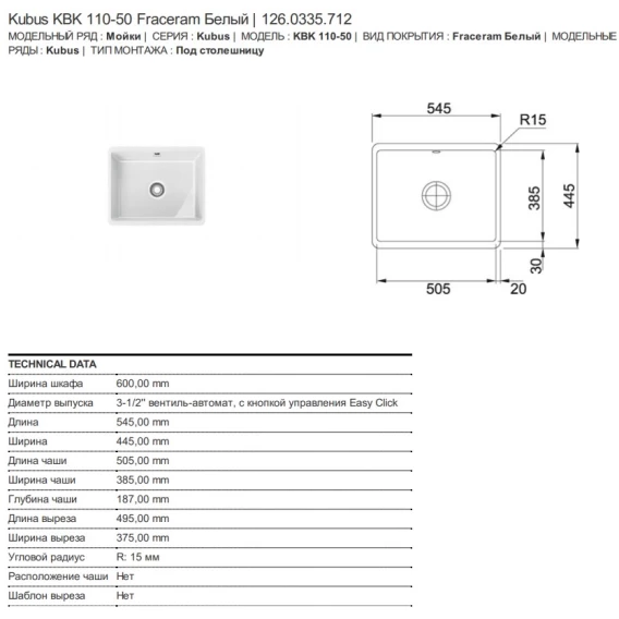 Кухонная мойка Fraceram Franke Kubus KBK 110-50 белый 126.0335.712