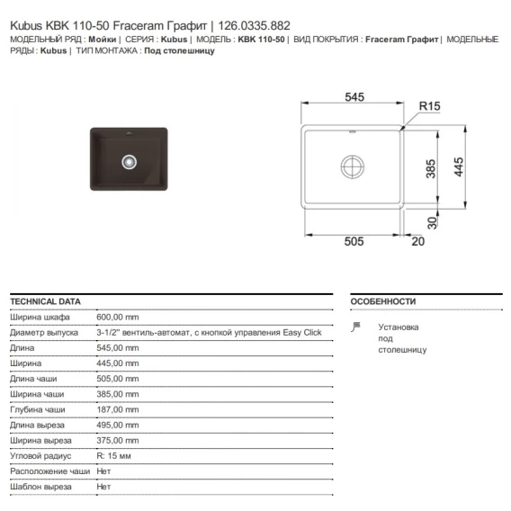 Кухонная мойка Fraceram Franke Kubus KBK 110-50 графит 126.0335.882