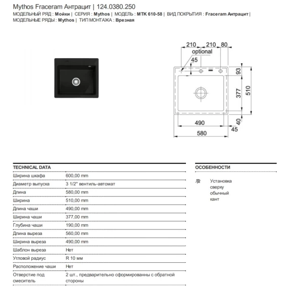 Кухонная мойка Fraceram Franke Mythos MTK 610-58 антрацит 124.0380.250