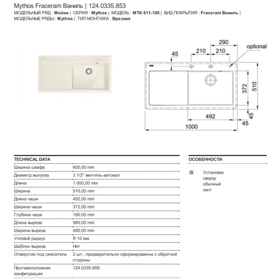 Кухонная мойка Fraceram Franke Mythos MTK 611-100 ваниль 124.0335.853