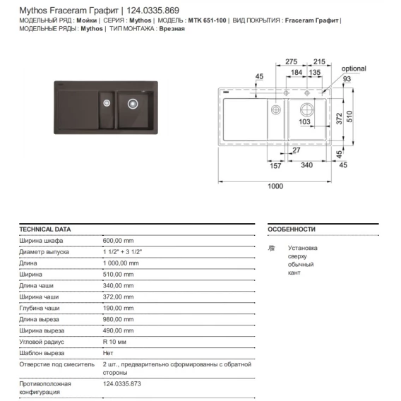Кухонная мойка Fraceram Franke Mythos MTK 651-100 графит 124.0335.869