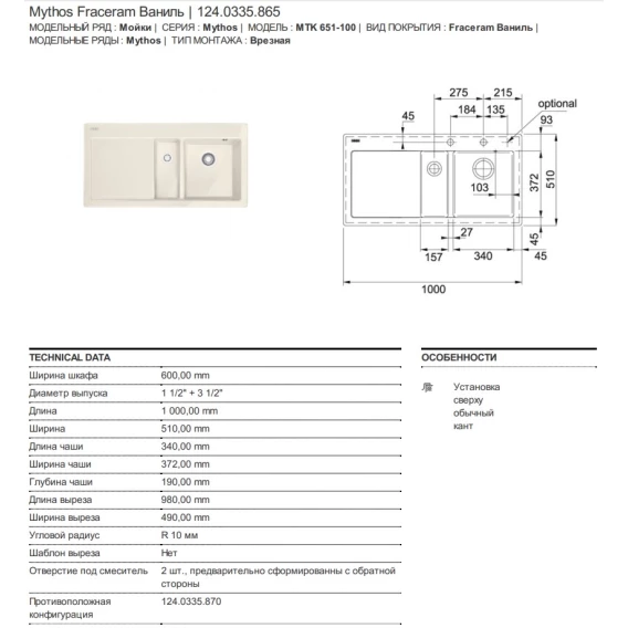 Кухонная мойка Fraceram Franke Mythos MTK 651-100 ваниль 124.0335.865