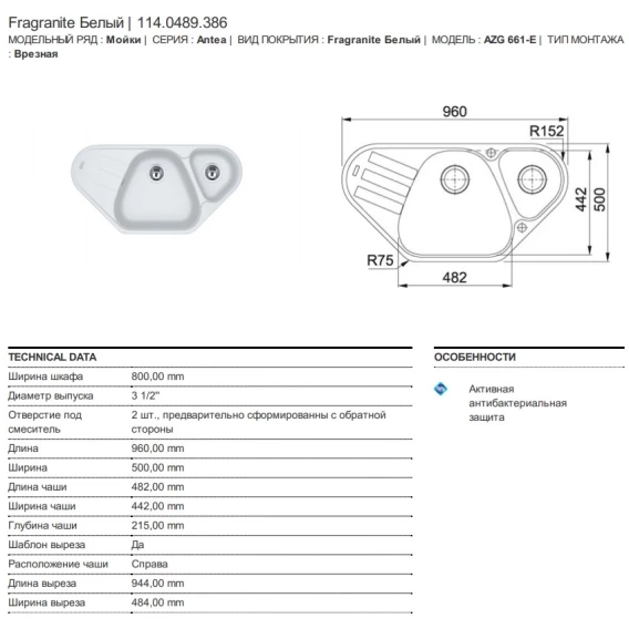 Кухонная мойка Fragranit Franke Antea AZG 661-E белый 114.0489.386