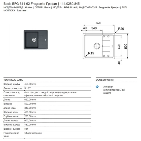 Кухонная мойка Fragranit Franke Basis BFG 611-62 графит 114.0280.845