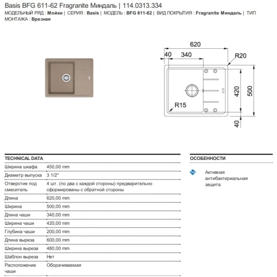 Кухонная мойка Fragranit Franke Basis BFG 611-62 миндаль 114.0313.334
