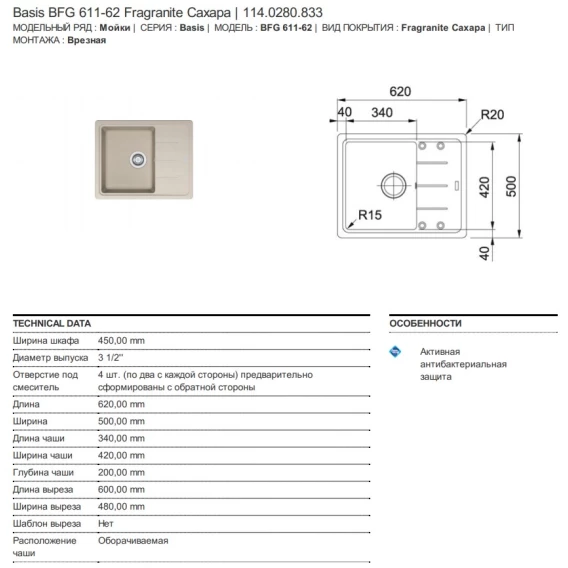 Кухонная мойка Fragranit Franke Basis BFG 611-62 сахара 114.0280.833