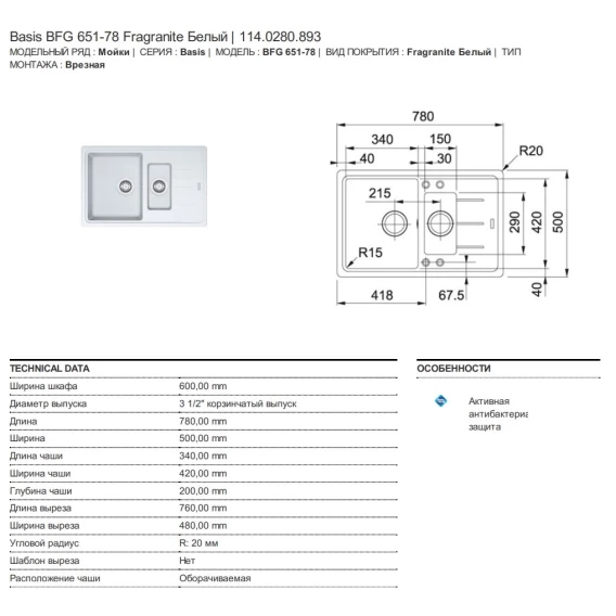 Кухонная мойка Fragranit Franke Basis BFG 651-78 белый 114.0280.893