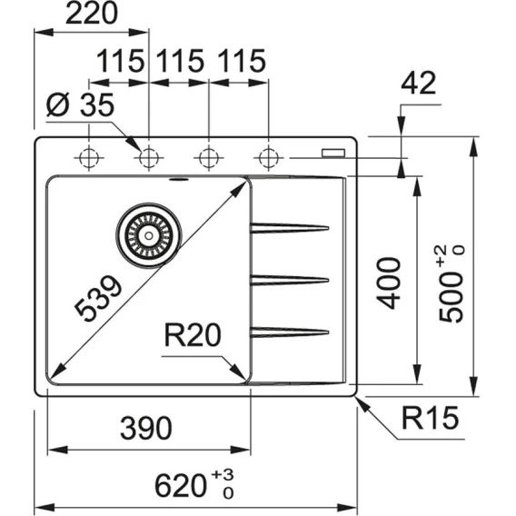 Намеченных отверстий для смесителя