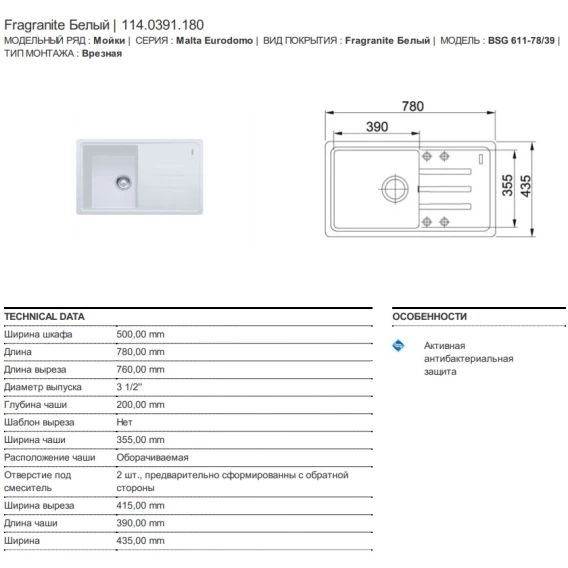 Кухонная мойка Fragranit Franke Malta BSG 611-78 белый 114.0391.180