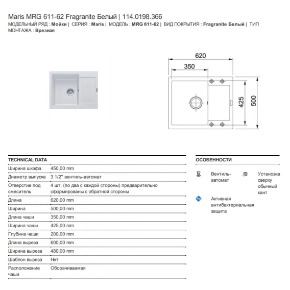 Кухонная мойка Fragranit Franke Maris MRG 611-62 белый 114.0198.366