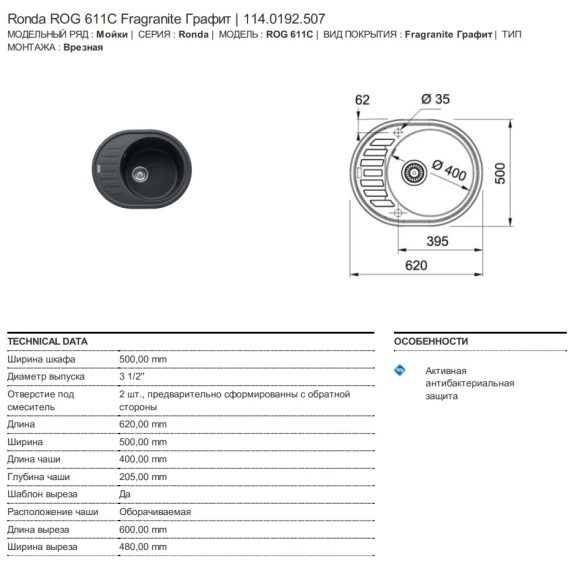 Кухонная мойка Fragranit Franke Ronda ROG 611С графит 114.0192.507