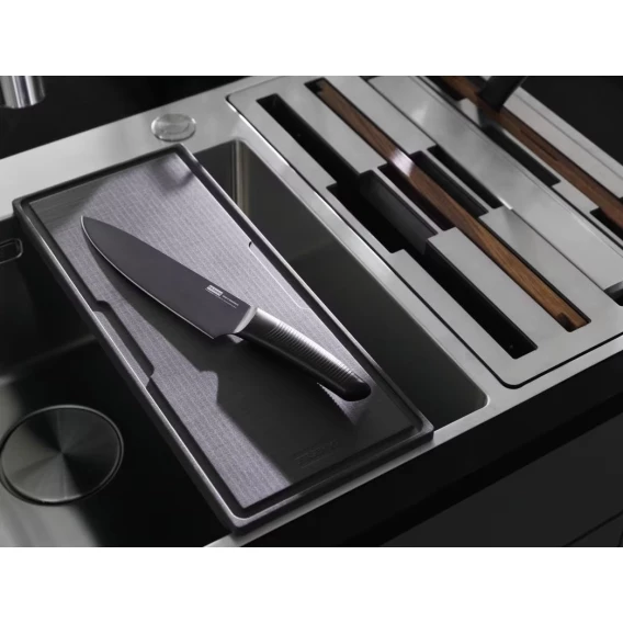 Мойка Box Center BWX 220-54-27 TL Рабочий центр слева, установка сверху или вровень со столешницей, выпуск 3,5'', декоративная накладка круглой формы в большой чаше, в комплекте: вентиль-автомат Easy Click, 2 разделочные доски (пластиковая и деревянная), миска из нержавеющей стали, 3 ножа (специально для хлеба, овощей, мяса/рыбы, деревянный держатель для ножей, крепления FastFix, монтаж на столешнице от 12 мм