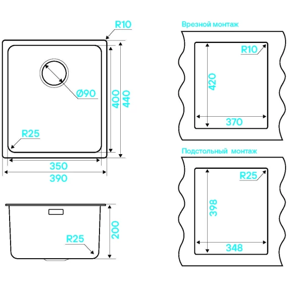 Встраиваемая сверху, Встраиваемая снизу, В один уровень со столешницей