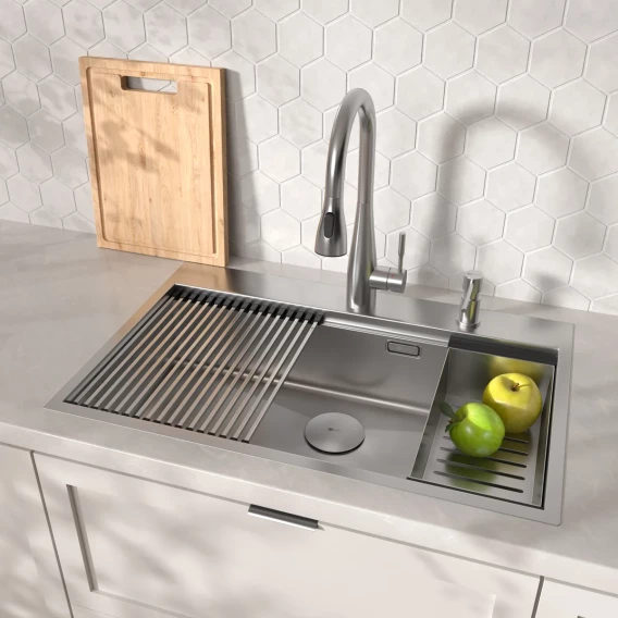 • Сливная арматура с выпуском 3 ½ (D-90мм) и сифон с возможностью подключения посудомоечной и стиральной машины