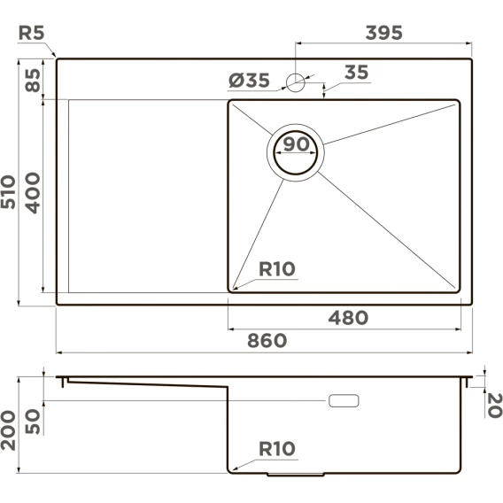 Кухонная мойка Omoikiri Akisame 86-IN-R Side 4997042 86x51 см, нержавеющая сталь