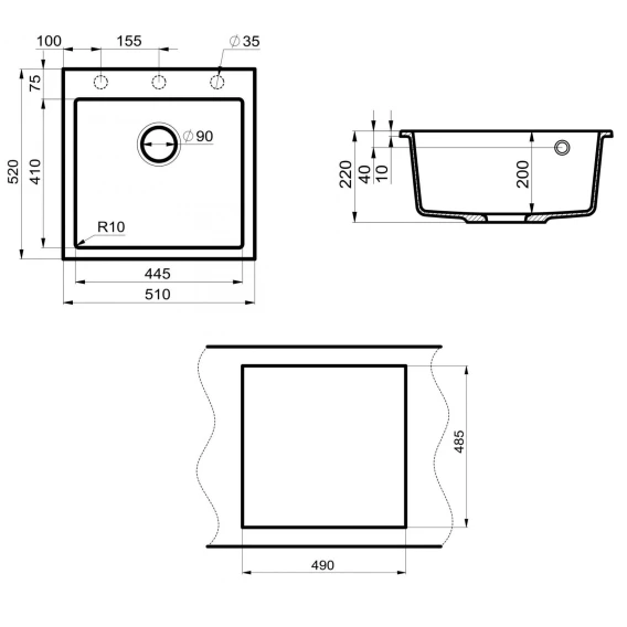 Намеченных отверстий для смесителя
