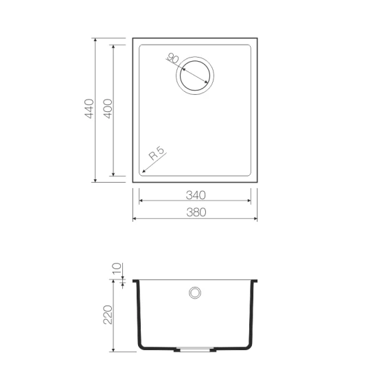 • Вырез под мойку: 340x400 мм.