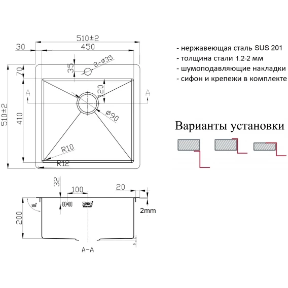 Кухонная мойка Zorg ZL R 510510 51x51 см, нержавеющая сталь