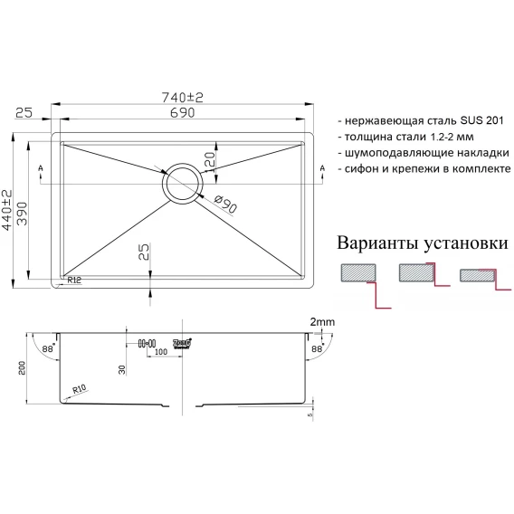 Кухонная мойка Zorg ZL R 740440 74x44 см, нержавеющая сталь